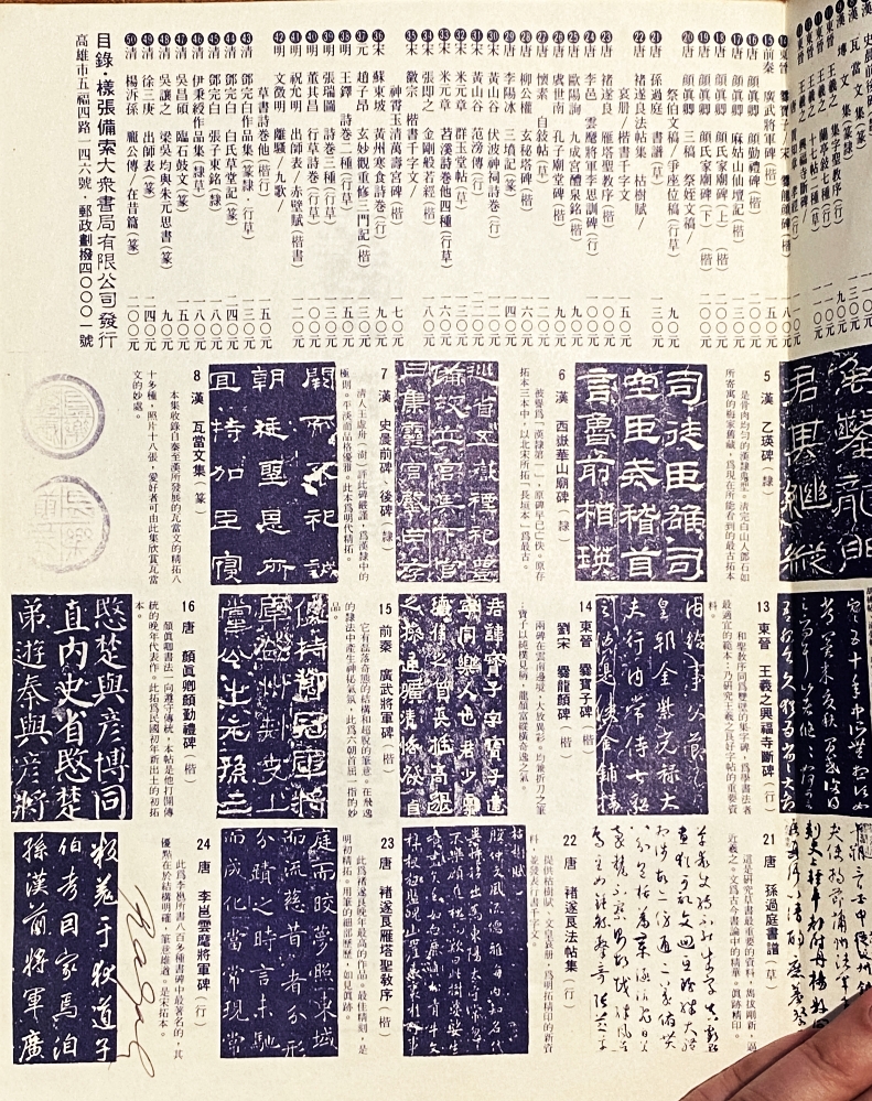 * Vroegmiddeleeuwse kalligrafie van de grote kalligrafen Wang Xizhi en Yan Zhenqing, en inscripties van de Northern Wei-dynastie. Drie delen (3, 6 en 7) uit een grotere serie. Samengesteld door Igaki Hokujo. Met medewerking van Zhu Jiuying (1898-1996, een contemporain kalligraaf op Taiwan). Uit de collectie van Ben Aalbers. Geen garantie op de correcte weergave van de tekst; ik vertrouwde op Google Translate Chinees-Engels. De meeste van deze namen zijn op de Engelse wikipedia terug te vinden.