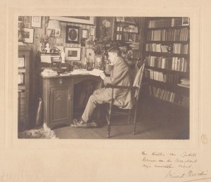 * Schitterende, haarscherpe studiefoto van de bekende Bosschenaar Cleerdin, een boek lezend, aan zijn bureau. Het loont de moeite alle portretjes op zijn bureau en boeken in de kast in detail te bestuderen. Met handgeschreven, gesigneerde opdracht aan ‘Den dichter van “Judith” Herman van den Eerenbeemt, mijn waardsten vriend’ met datum ‘Pinksterfeest, 1916’. Vincent Cleerdin (1888-1946) was een bekend bevorderaar van de belangstelling voor Brabant, waarover hij uiteenlopende boeken schreef. Een van zijn wapenfeiten was het verheffen van Driekoningen van bedelpartij tot lichtjesfeest. In het dagelijks leven was hij griffier van de Staten van Noord-Brabant. Weijnen (1861-1933) was een bekend fotograaf te ‘s-Hertogenbosch.