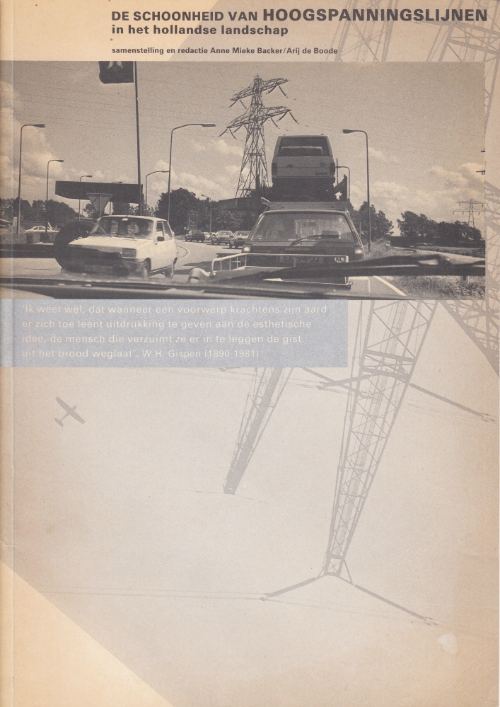 1. BACKER, Anne Mieke, & Arij de BOODE De schoonheid van hoogspanningslijnen in het Hollandse landschap. Rotterdam, De Hef, 1986. 29 x 21 cm. Ingenaaid. (48) p. Geïllustreerd. 1e druk. Kreukje rechtsonder, wat verkleurd.