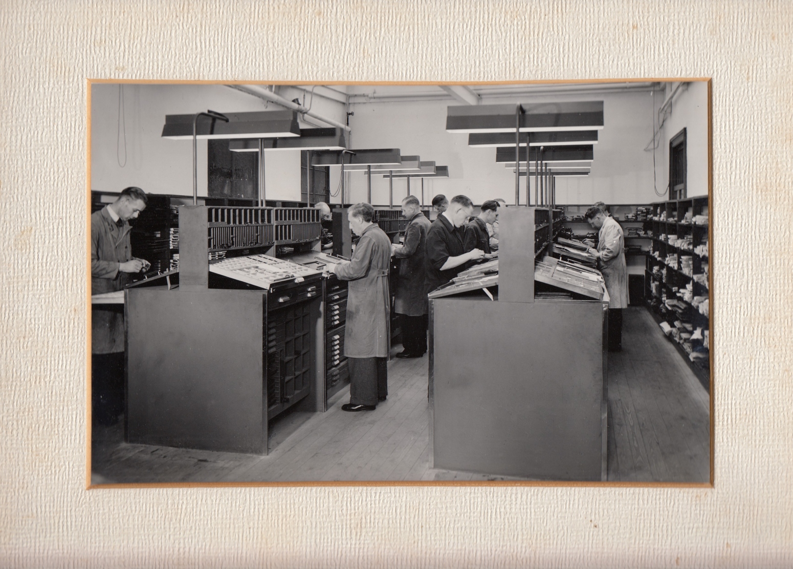 * Een tiental in stofjas geklede handzetters is aan het werk onder moderne lampen. Een mooie, professionele foto die meekwam met het Vriendenalbum voor Herman van den Eerenbeemt, directeur van onder andere Van Munster’s Drukkerijen te Amsterdam (zie nr. 33 in deze nieuwsbrief); misschien is de foto daar genomen.