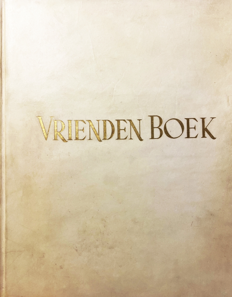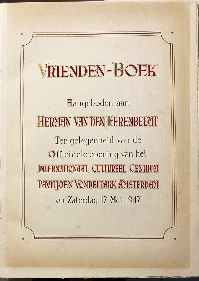 33. PAVILJOEN VONDELPARK Vrienden-boek aangeboden aan Herman van den Eerenbeemt ter gelegenheid van de officiële opening van het Internationaal Cultureel Centrum Paviljoen Vondelpark Amsterdam op Zaterdag 17 Mei 1947. Heelperkament (met beschermpapier). Beletterd in goud: ‘Vrienden boek’. Met in rood en goud gedecoreerde, gekalligrafeerde titelpagina. Zeer groot formaat: 46 x 30 cm. Ca. 72 bladen lichtgetint Hollandsch papier van Van Gelder, waarvan er 34 beplakt met elk 14 (of minder) gesigneerde visitekaartjes, in totaal ruim 450. 36 bladen zijn blanco gebleven (genoeg voor een kleine bibliofiele oplage!). Titelpagina wat verbruind. Inliggend een document van de bank Kas-Vereeniging: 455 intekenaren hebben samen fl. 9215 toegezegd ten behoeve van het Herman van den Eerenbeemtfonds voor hulp aan jonge kunstenaars.