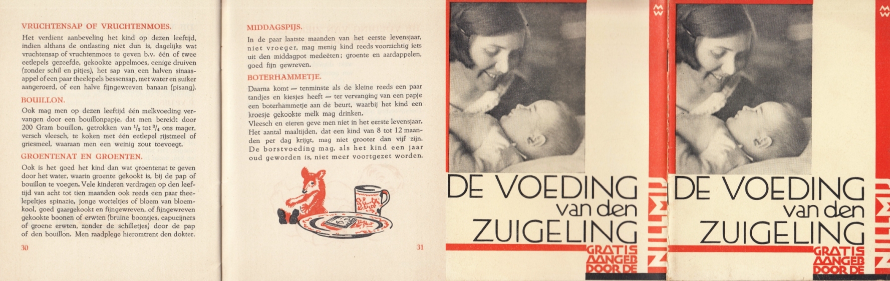 31. NILLMIJ De voeding van den zuigeling. Een gids voor moeders samengesteld in opdracht van den Nederl. Bond tot Bescherming van Zuigelingen en de Nederl. Vereeniging voor Kindergeneeskunde. Den Haag, NILLMIJ, [1929]. 15 x 12 cm. Geniet. 32 p. Gedrukt in rood en zwart. Met tekeningen. Zeer gaaf.