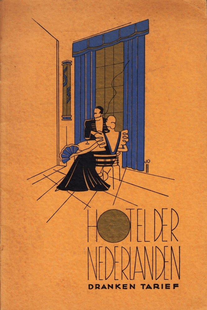 18. HOTEL DER NEDERLANDEN Hotel der Nederlanden – Batavia-C. Drankenkaart. Batavia, Hotel der Nederlanden, ca. 1935? Geniet. 20 p. Gedrukt in rood en zwart op gehamerd luxepapier, omslag in blauw en goud op stevig oranjeachtig papier. Met uitgestanste ‘duimgrepen’. Elegante tekeningen gesigneerd ‘Jo’. Gaaf.