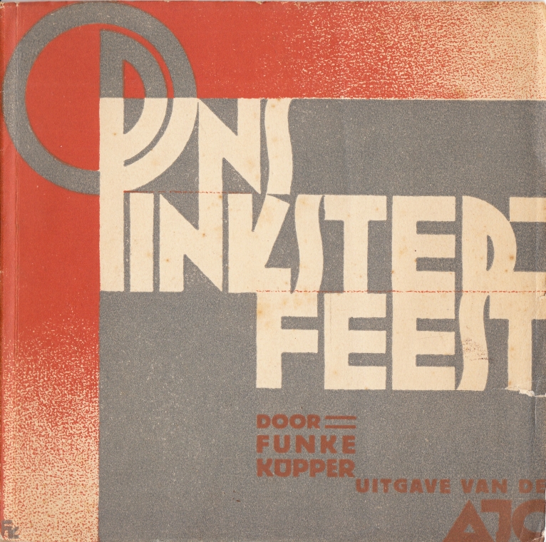 28. FÜNKE KÜPPER, Albert Ons Pinksterfeest. Amsterdam, AJC, 1928. 18 x 18 cm. Orig. gedecoreerd omslag naar ontwerp van Fré Cohen. 32 p. Tekeningen van Albert Funke Küpper. 1e druk. Schutbladen verbruind. Scheur in vooromslag.