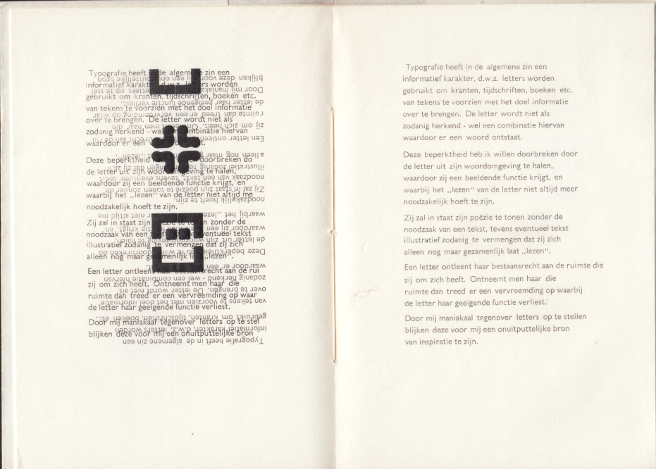 * ‘Zij zal in staat zijn poëzie te tonen zonder de noodzaak van een tekst’. Betoogje over typografie met intrigerende illustratie. In een omslag van wit, zachtglanzend Japans papier dat dankzij de envelop gaaf en fris is gebleven. Dit exemplaar was blijkens het colofon bestemd voor Dick Dooijes zelf. Een tweede exemplaar zonder envelop is te koop voor 35 euro.