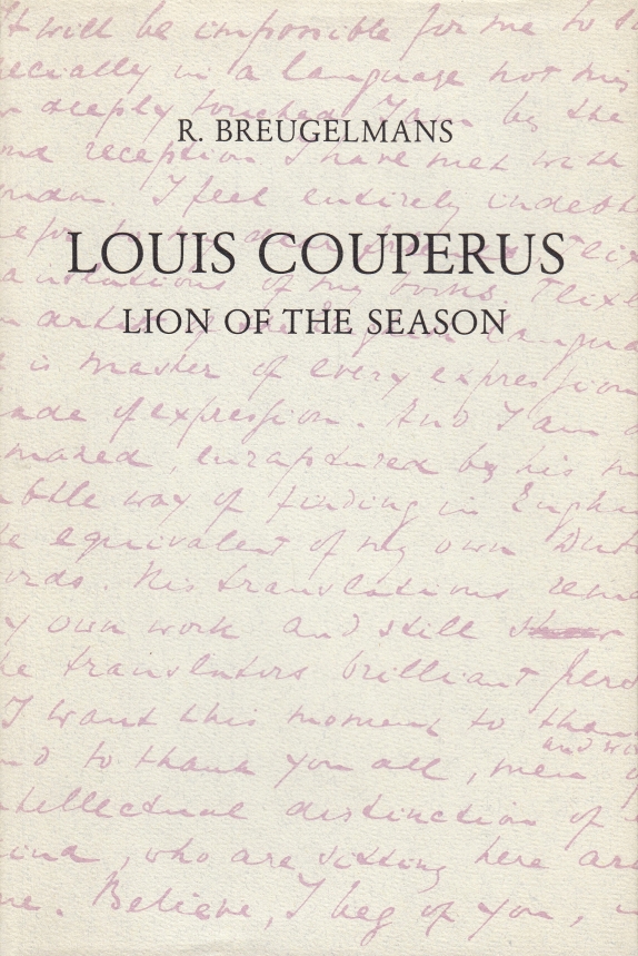 19. (COUPERUS, Louis). BREUGELMANS, R. Louis Couperus. Lion of the season. Raamsdonk, De Roofpers, 1982. Linnen met stofomslag. 28 p. Gezet uit de Garamond en gedrukt op 140 grams Hollands luxe druk vergé in een oplage van 36 genummerde exemplaren: 30 genummerd van 1-30 en zes Romeins genummerde. Met facsimiles naar het handschrift van Couperus, gedrukt in paars. 1e druk.