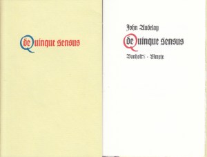 1. AUDELAY, John De Quinque Sensus. Banholt, In de Bonnefant, 2019. Rudolf Koch-serie. Cahiersteek met stofomslag. 8 p. Gezet uit de letter Wilhelm Klingspor-Schrift en gedrukt in rood en zwart op fraai geschept papier van Barcham Green in 36 exemplaren. Zeer fris.