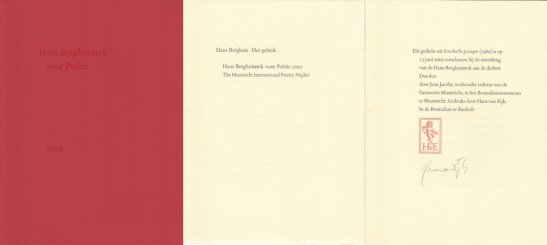 3. BERGHUIS, Hans Het gebrek. Hans Berghuisstok voor Poëzie 2002 / The Maastricht International Poetry Nights. Banholt, In de Bonnefant, 2002. 25 x 18 cm. Vouwblad in omarmend omslag. Gedicht, gedrukt in rood en zwart op getint gehamerd papier. Zeer gaaf.