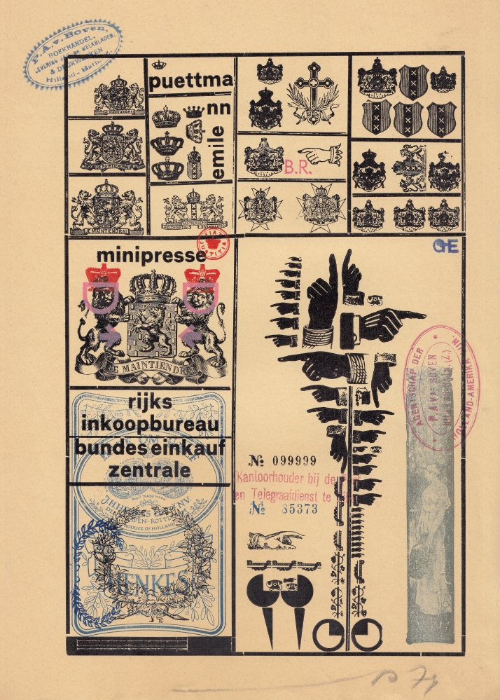 4. Emile Puettmann Minipresse. Monotypie, gesigneerd ‘P’ en gedateerd ’74’. 29,5 x 21 cm. Diverse clichés, stempels en andere vormen van boekdruk.