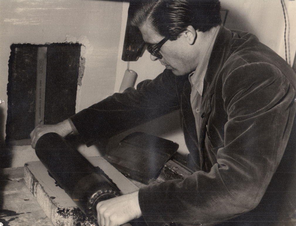 37. PUETTMANN, Emile Diverse drukwerken en een foto. 1. Grote originele zwartwitfoto (21 x 27,5 cm) van Puettmann, tweede helft dertig en gekleed in een ribjasje, bezig een lithosteen in te inkten. Op de achtergrond staat een boek met het jaar 1955. De foto heeft wat opprik- en lijmsporen.
