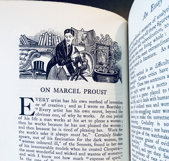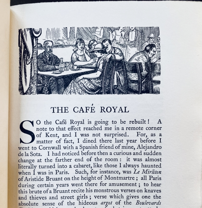 40. SYMONS, Arthur The Café Royal. London, The Beaumont Press, 1923. Half buckram met gedecoreerde platten. (12), 64 p. Met vignetten van Randolph Schwabe. Herinneringen en essays over o.a. Arthur Rimbaud en zijn biograaf Paterne Berrichon, over Marcel Proust, Eleonora Duse, Christopher Marlowe, Wilfrid Scawen Blunt en natuurlijk het Café Royal zelf. Gedrukt op zwaar handgeschept papier in 390 genummerde exemplaren (nr. 226). 1e druk. Zeer fris en gaaf exemplaar met in potlood de handtekening van vertaler en uitgever Roger Senhouse, Lytton Strachey’s geliefde, met de prijs die hij betaalde: 2 guineas. En wat een genot om zo’n gaaf bibliofiel boek in de hand te hebben, 102 jaar oud maar unblemished, werkelijk als nieuw.