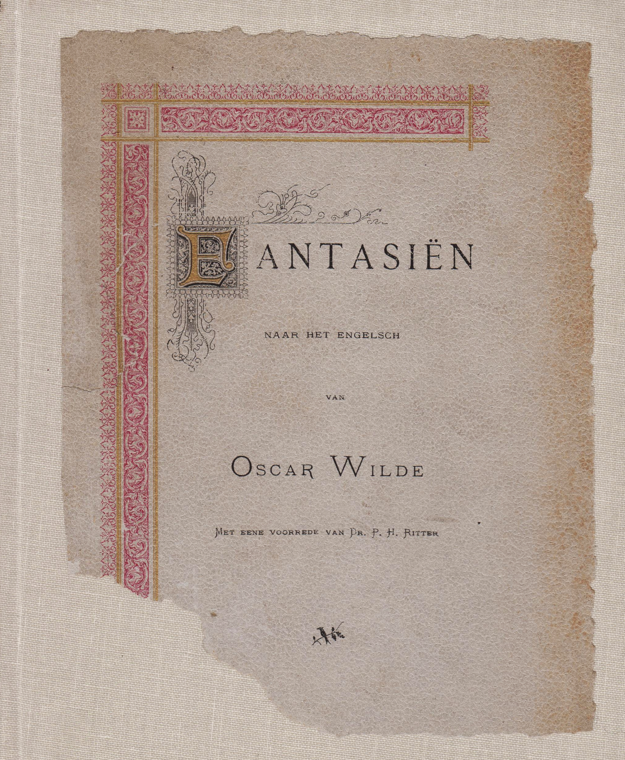 43. WILDE, Oscar Fantasiën. Naar het Engelsch. Met eene voorrede van Dr. P.H. Ritter. (Translated into Dutch). Utrecht, J.L. Beijers, 1889. 22 x 17 cm. Herbonden in linnen, deel origineel omslag opgeplakt. 84 p. Geïllustreerd. Gedrukt in rood en zwart. 1e druk. Hoek uit or. omslag gescheurd, zonder tekstverlies.