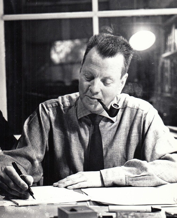 14. HOLSBERGEN, J.W. Drie originele zwartwitfoto’s, gemaakt door zijn zoon Sjoerd J. Holsbergen. Twee foto’s in het formaat 24 x 18 cm, waarop Holsbergen, met pijp, aan een tafel zit te schrijven met een vulpen. Achterop stempel van de fotograaf. Een foto van 15 x 22 cm, geplakt in passepartout, met pijp achter een autodak. Op het passepartout zijn drukkersaanwijzingen geschreven. Met drie drukproeven van deze laatste foto (gedateerd 1964), waarop een beschadiging wordt weggewerkt.