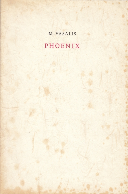 37. VASALIS, M. Phoenix. (Met een portrettekening door Siegfried Woldhek). Amsterdam, (Binderij Phoenix/ Phoenix Editions) 1983. Ingenaaid met stofomslag van botanisch papier (met stukjes riet). (12) p. Met de hand gezet uit de Lectura door Hans van Eijk (= In de Bonnefant) in rood en zwart in een oplage van 125 genummerde exemplaren. Omslag wat roestig.