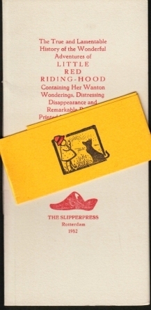 23. PUETTMANN, Emile The True and Lamentable History of the Wonderful Adventures of Little Red Riding-Hood. Containing her Wanton Wonderings, Distressing Disappearance and Remarkable Release. Printed for your Exclusive Entertainment by Emile Puettmann. Rotterdam, The Slipperpress, 1982. 18,5 x 9 cm. Omslag met geïllustreerd buikbandje. 12 p. Met drie oude houtsneevignetten, grel ingekleurd. Gezet uit de Hollandsche Mediaeval en gedrukt in 80 genummerde exemplaren. 1e druk. Mooi.
