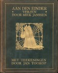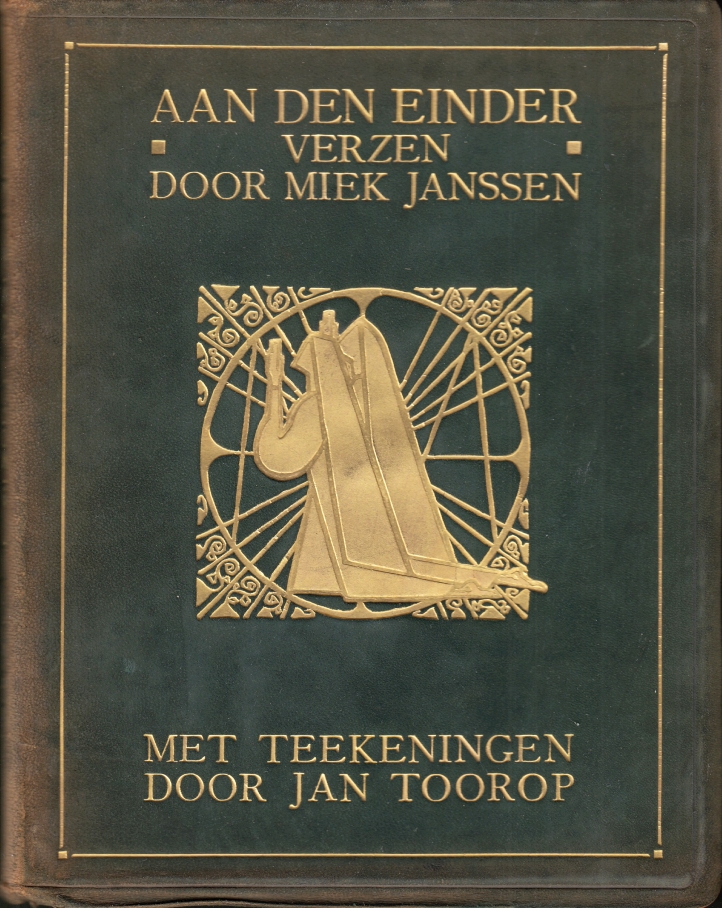 33. (TOOROP, Jan). JANSSEN, Miek Aan den einder. Verzen. Met teekeningen door Jan Toorop. (Genummerd exemplaar in soepel heelleer). (Amsterdam, L.J. Veen, 1915). Rijk verguld soepel leder (groen suède). Kop verguld. Niet afgesneden. (8), 120 p. Gedrukt in 600 genummerde exemplaren. De in lichtdruk uitgevoerde tekeningen zijn beschermd met zijdevloei. 1e druk. Rug verschoten. Aardig exlibris van ‘AJB’ met vermelding Oosterbeek.