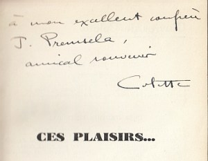 8. COLETTE Ces plaisirs. (Met opdracht). Paris, J. Ferenczi & Fils, 1932. Herbonden in karton, oorspronkelijke voorkant opgeplakt. 256 p. Gedrukt in 1470 genummerde exemplaren. Édition originale (1e druk). Met een klein boekbindersmerk (‘J. Bergkamp/ Zwolle’). Leessporen en enkele aantekeningen over personen in het boek door Premsela op de laatste pagina.