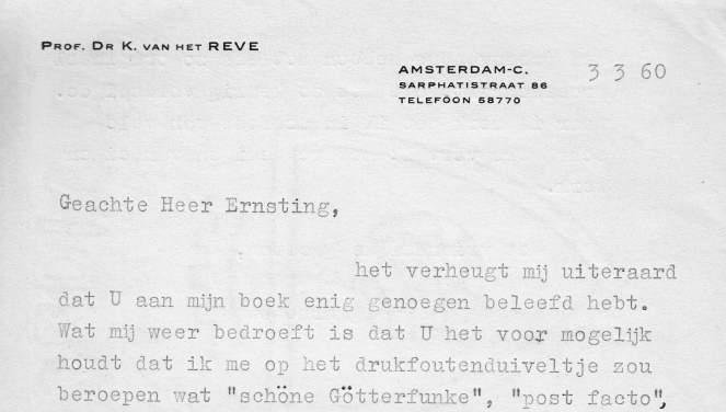 * Geadresseerde had Van het Reve blijkbaar een brief geschreven met kritiek op Twee minuten stilte. Ernsting had een aantal fouten opgesomd waar Van het Reve op ingaat. Verder: ‘wat die rancune tegen collega’s betreft geloof ik dat u me onrecht doet. (…) Enkele van mijn beste vrienden lopen te Amsterdam mee in die stoet, en in Leiden loop ik zelf mee. Bovendien is het ontzettend flauw. lijkt me, om als je iets tegen collega’s hebt dat op die manier te uiten. Dan liever een open gevecht.’ Hij eindigt met ‘Maar ik merk dat ik de fout van vele schrijvers verval: het verdedigen van eigen werk’.