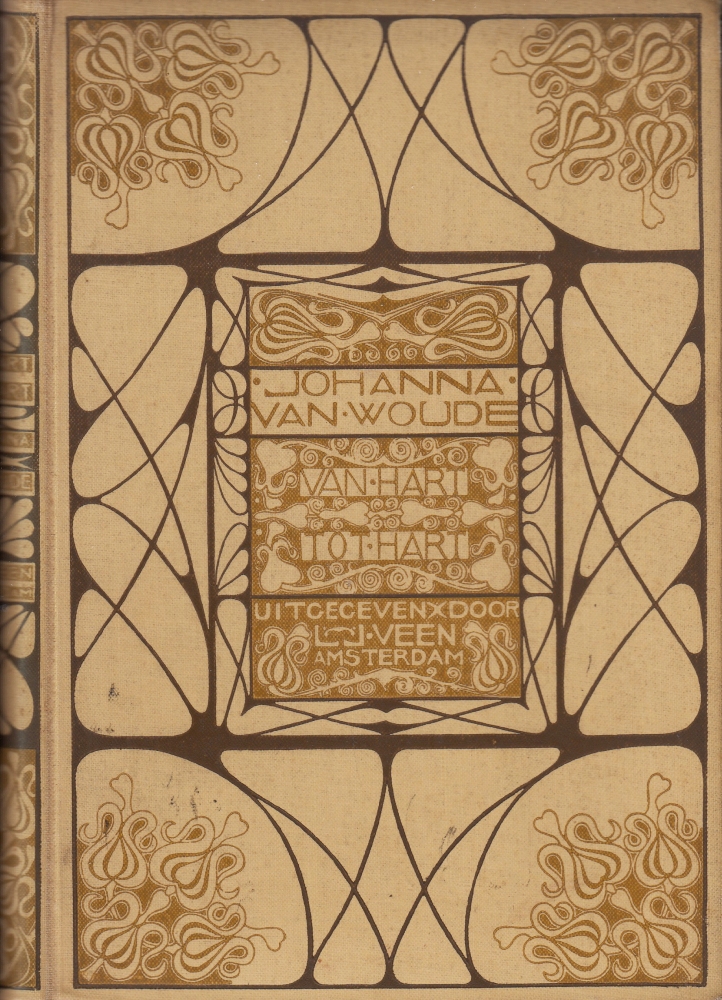 22. (NEUHUYS, Theo). S.M.C. van WERMESKERKEN-JUNIUS (Johanna van WOUDE) Van hart tot hart. Amsterdam, L.J. Veen, [1900]. Versierd linnen (door Theo Neuhuys). 200 p. 1e druk. Band zeer fraai. Het binnenwerk heeft enkele kreukjes. Fraai exlibris van M.H. Werkman.
