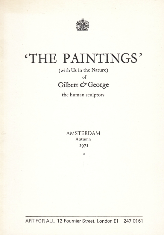 13. GILBERT & GEORGE ‘The Paintings’ (With Us in the Nature) of Gilbert & George, the human sculptors. Londen, Art For All (in samenwerking met het Stedelijk Museum en de Kunstverein für die Rheinlande und Westfalen), 1971. Geniet. 4 p. Met een foto (‘Detail from Sculpture’). 1e druk. Netjes.