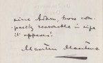 29. MAARTENS, Maarten Handgeschreven brief aan uitgever Funk & Wagnalls in Londen. 17,7 x 11,2 cm. 4 p. waarvan 2 beschreven en 1 met stempel van de uitgever. Gesigneerd ‘Maarten Maartens’ (dik onderstreept) en gedateerd ’11-11-’13’/ Holland’. 17 regels. Brief in het Engels met gedrukt adres ‘De Zonheuvel, Doorn.’. Met gaatjes waar wellicht een visitekaartje heeft gezeten. Vage lijmsporen aan achterzijde.