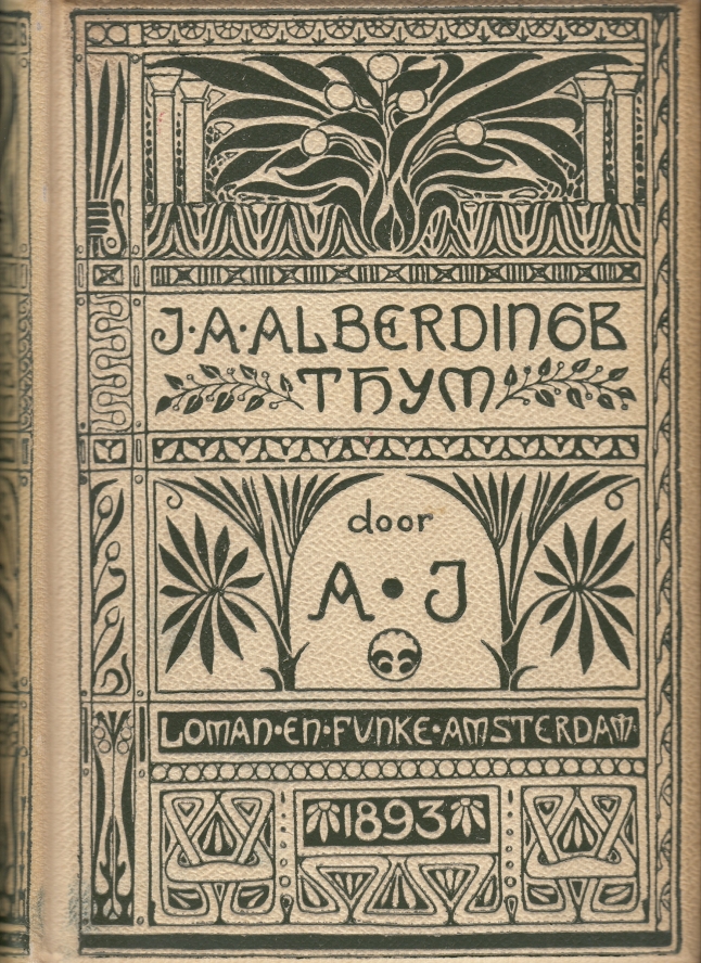 12. DEYSSEL, L. van (als:) A.J. J.A. Alberdingk Thijm. (Met een frontispice door Jan Veth; titelversiering en sluitvignet door Antoon Derkinderen). Amsterdam, Loman & Funke, 1893. Gedecoreerd crêpe linnen met facetranden en opdruk in groen met achterop een groot monogram van de uitgeverij (bandontwerp Antoon Derkinderen). (8), 374 p. 1e druk. Rug wat verkleurd, verder mooi. Voorin de handtekening van J. Karsemeyer (23 juni 1920, waarschijnlijk de neerlandicus Jan Karsemeyer (1896-1966) uit Dordrecht, rector van scholen in Dordrecht en Rotterdam).