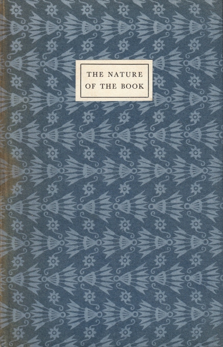 45. WARDE, Beatrice The Nature of the Book. Birmingham, Birmingham School of Printing, Central School of Arts and Crafts, 1930. Gedecoreerd karton met bijpassend foedraal. 32 p. Gezet uit de Monotype Baskerville en gedrukt in rood en zwart door leerlingen op de Birmingham School of Printing onder leiding van Leonard Jay. Foedraal deels verbleekt en iets versleten (en het is iets te krap). Rug boek verkleurd.