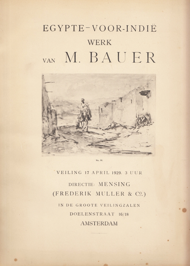 2. BAUER, Marius Werk van M. Bauer (Egypte – Voor-Indië). Veiling 17 April 1929. Amsterdam, Directie-Mensing (Frederik Muller & Co.), 1929. 31 x 25 cm. Ingenaaid. (24) p. 18 eenzijdig in zwartwit bedrukte illustratiebladen. Achterin zijn twee andere platen van Bauer ingeplakt. Omslag wat verbruind en met vlekjes en kreukjes. Voorin de naam van [de Engelandvaarder en drager van het Kruis van Verdienste, 1919-2006] L.J. van der Meulen.