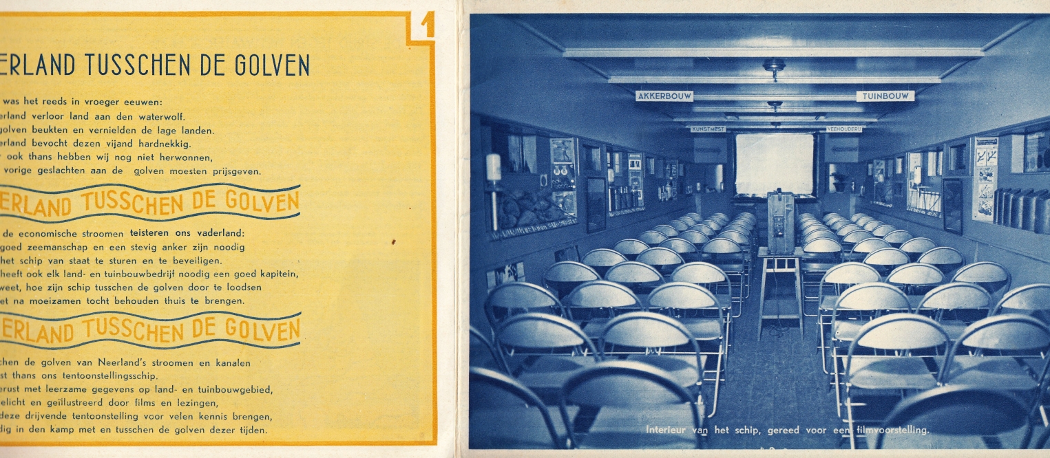 43. SPAAN, C.A.G. Nederland tusschen de golven. Gids voor de tentoonstelling. Amsterdam, Land- en Tuinbouwbureau der I.G. Farbenindustrie Aktiengesellschaft, [1936]. Oblong. Geniet. 16 p. met een omslag van 6 p. Gedrukt in blauw, geel en wit (of zilver). Zeer gaaf.