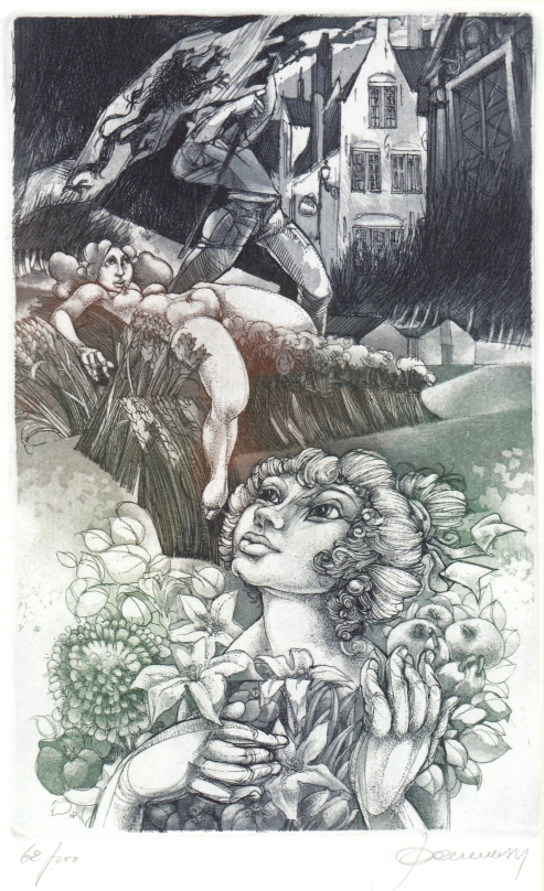 18. HOFFMANN von FALLERSLEBEN, A.H. Zeven gedichten in het Middelnederlands. Beek, In de Roozetak, 1992. 29 x 19 cm. Ingenaaid met stofomslag. (24) p. Met originele, gesigneerde kleurenets van Hedwig Pauwels. Met de hand gezet uit de Bembo door Jan Keijser en gedrukt bij de Avalon-pers op Zerkall-Bütten in 100 genummerde exemplaren.