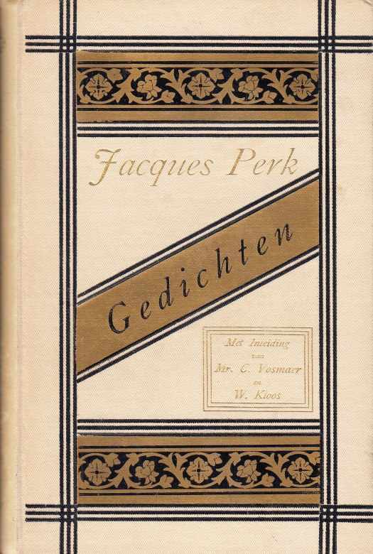 34. PERK, Jacques Gedichten. Met Voorrede van Mr. C. Vosmaer en inleiding van Willem Kloos. (Met een originele foto van de auteur als frontispice). Sneek, Pijttersen, 1882. Verguld linnen. Kop verguld. (4), 184 p. Debuut. 1e druk. Rug boven- en onderaan zeer licht beschadigd, rugbelettering wat vervaagd, voorste kneep iets zwak, maar echt een opvallend goed exemplaar van een kwetsbaar boekje. Zo’n fijn exemplaar hebben we al lang niet meer in handen gehad.
