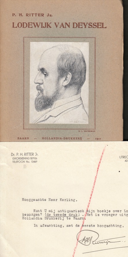 * Bijgevoegd is een getypte brief van de auteur, gedateerd ‘Utrecht, 2 April 1935’ en gesigneerd ‘P.H. Ritter jr.’, aan ‘Hooggeachte heer Kerling’: ‘Kunt u mij antiquarisch mijn boekje over Lodewijk van Deyssel bezorgen? (de tweede druk). Het is vroeger uitgekomen bij de Hollandia Drukkerij te Baarn’, Drie regels tekst. Jean Baptist Joseph Kerling (1869-1947) was de eigenaar van veilinghuis-uitgeverij Van Stockum in Den Haag.