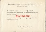 * Het betreft een deels voorgedrukte oorkonde (‘is tot erelid van de Maatschappij der Nederlandse Letterkunde benoemd (…) ten bewijze waarvan dit diploma is uitgereikt’), de naam van Louis Paul Boon is met de hand in rood gekalligrafeerd, de datum (’12 december 1972′) in zwart. De handtekeningen van de voorzitter en de secretaris ontbreken: dit is wellicht een proefexemplaar van de kalligraaf, of een archiefexemplaar.