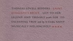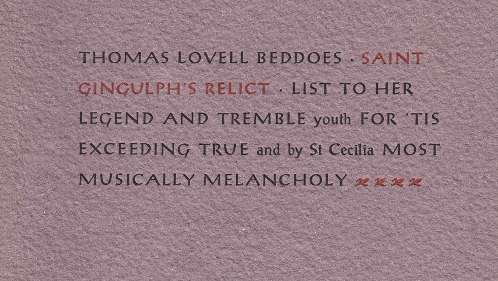 2. BEDDOES, Thomas Lovell Saint Gingulph’s Relict. List to her Legend and Tremble youth for ‘tis Exceeding True and by St Cecilia Most Musically Melancholy. Banholt, Ioannes Quercus [= Hans van Eijk] at the Officina Borogovi, 2000. Genaaid met paarse omslag (Indiaas lompenpapier) en schutbladen (Hahnemühle). 8 p. Gezet uit de Post-Antiqua en gedrukt in rood en zwart op dun geel geschept papier in 36 genummerde exemplaren.