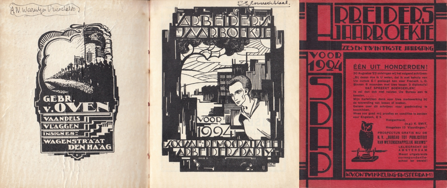 * Omslag met reclame voor het Bureau tot Publiciteit van Wetenschappelijk Nieuws en voor De Centrale Arbeiders-Verzekerings- en Depositobank. Titelpagina getekend door Fré Cohen, en daar tegenover een mooie advertentie getekend door Albert Hahn jr. voor een firma die vaandels, vlaggen en insignes leverde! Handig voor demonstraties.