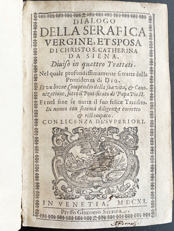 5. CATHARINA VAN SIENA Dialogo della serafica vergine, et sposa di Christo S. Catherina da Siena diviso in quattro trattati. Nel quale profondissimamente si tratta della providenza di Dio. Et un breve compendio della sua vita, & canonizatione sotto il pontificato di Papa Pio II. Et nel fine se narra il suo felice transito. Venetië, Giacomo Sarzina, 1611. Perkament met titelschildje. (32), 652 p. Houtsnede: de Kruisafname op p. (8). Met een renaissance-kapitaal en verschillende sierranden van zetmateriaal. Herdruk. Rug wat vuil, de naakte vrouw in het emblematische drukkersmerk is deels met oude inkt doorgestreept (!). Met enkele (17e-eeuwse) notities en onderstrepingen, maar verder een heel net exemplaar.