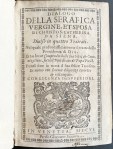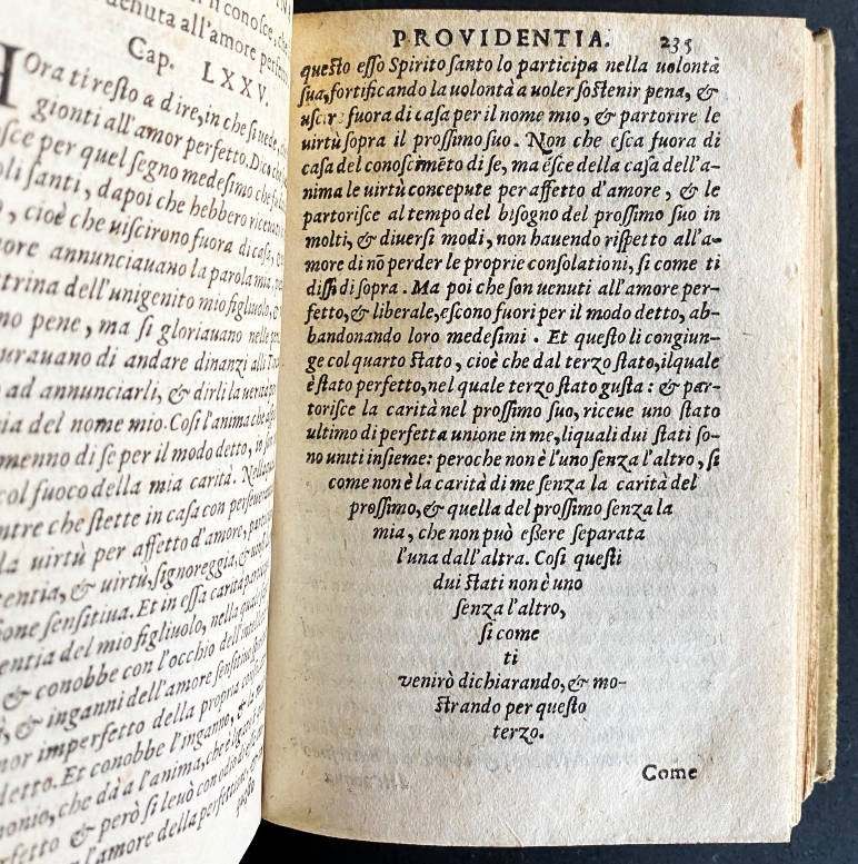 * Dialoog van de goddelijke voorzienigheid van Catharina van Siena, voorafgegaan door een inleidende brief en de heiligverklaring door paus Pius II (1461), en gevolgd door enkele contemporaine teksten van vrienden van Catharina. Dit is een typografisch mooi renaissanceboek, grotendeels gezet uit een prachtige cursieve letter. Afkomstig uit de boekerij van ‘hagiograaf’ Emile Erens.