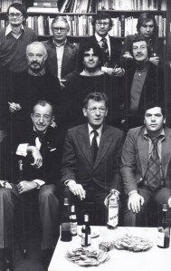* Iconische foto op groot formaat van negentien columnisten en tekenaars, genomen in de kamer van de toenmalige directeur van De Bezige Bij, Geert Lubberhuizen. De foto dateert uit 1976, dit is een latere afdruk, maar wel met de sticker van Eddy Posthuma de Boer. We zien, in alfabetische volgorde, G. Brands, Remco Campert, Simon Carmiggelt, Herman Hofhuizen, Henk Hofland, Eelke de Jong, Henri Knap, Kees van Kooten, Rudy Kousbroek, Tim Krabbé, G.L. van Lennep, Willem van Malsen, Ischa Meijer, Frits Muller, Joost Roelofsz, Nico Scheepmaker, Peter van Straaten, Julius Vischjager en Wim Zaal. Misschien kunt u helpen met de nog niet geïdentificeerde Bij-ers? (De afbeelding is een uitsnede uit de foto).