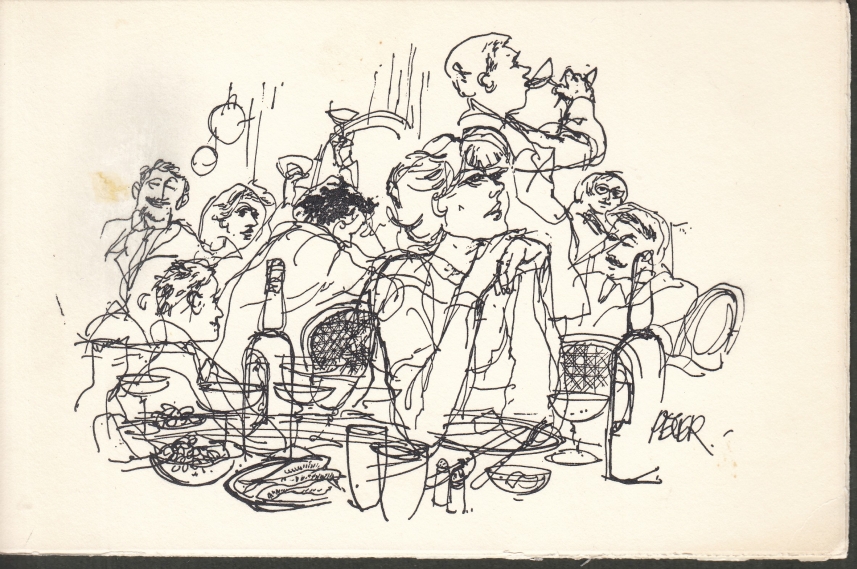 * Op de voorzijde is een gedrukte tekening te zien van een feest met veel spijs en drank, In de kaart schreef Van Straaten in hoofdletters ‘De beste, de bovenste beste wensen / voor het komende jaar./ Peter’.