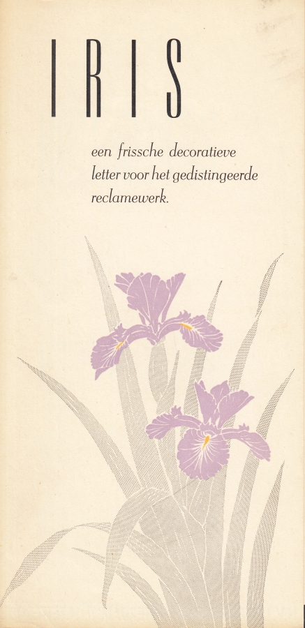 42. LETTERPROEF Iris. Een frissche decoratieve letter voor het gedistingeerde reclamewerk. Amsterdam, Lettergieterij “Amsterdam” voorheen N. Tetterode, [1940]. Leporello (6 p.) van 26 x 13 cm, gedrukt in geel, paars en zwart.