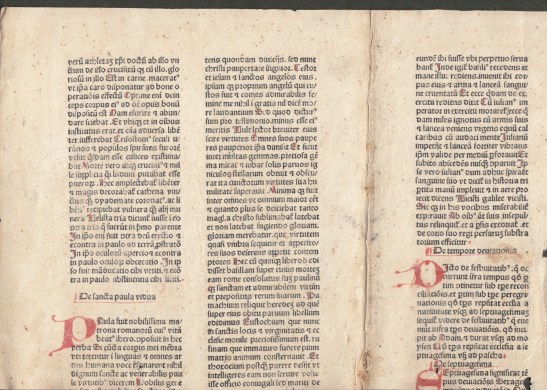 * Het betreft hier een stuk tekst uit Voragine’s Latijnse Gouden Legende met het kopje ‘De conversione sancti Pauli’ (Over de bekering van de heilige Paulus), dat op een eerdere, hier niet aanwezige bladzijde begint, en ‘De sancta paula vidua’ (Over de heilige Paula, de weduwe). Op de aanhangende pagina staat het eind van het verhaal over de monnik Julianus en op de achterkant een deel van de paragraaf over de feestdag ‘zondag Septuagesima’, dat is de eerste zondag van de vóórvasten (dit jaar op 16 februari), een feestdag die tegenwoordig niet meer gevierd werd in de Rooms-katholieke kerk, maar wel in de tijd dat dit boek gedrukt werd. Watermerk zichtbaar. We hebben nog enkele van deze bladen uit ditzelfde boek, ISTC nr. ij00093000.