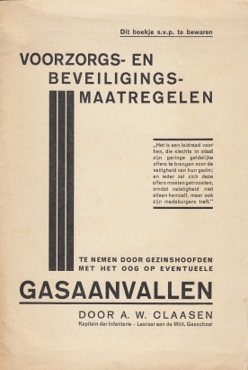 6. CLAASEN, A.W. Voorzorgs- en beveiligingsmaatregelen te nemen door gezinshoofden met het oog op eventueele gasaanvallen. Den Bosch, Teulings, [1935]. Geniet. 16 p. Met verklarende tekeningen. 1e druk. Goede staat.