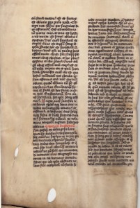 55. WILLEM VAN ST. THIERRY Fragment uit een brief aan Bernardus van Clairvaux (maculatuur). Eén blad stevig perkament, 30 x 19 cm. Tweezijdig beschreven in twee kolommen met hulplijnen. Gotische letter met gesloten a, lange s en f met staarten. Veel ligaturen. Donkerbruine en rode inkt. Gerubriceerd. Wellicht ca. 1400. Het blad is waarschijnlijk gebruikt als bandversteviging, met een sterke vouw. Twee gaten in de marge (zie afbeelding) hebben mogelijk een natuurlijke oorzaak.