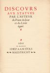 45. (STOLS, A.A.M.). (AVELINE, Claude) Discours aux statues par l’auteur du Point du Jour et du Livre égaré. Maastricht, A.A.M. Stols, 1930. 25 x 18 cm. Ingenaaid met flappen en titeletiket. 24 p. Gezet uit de Lutetia van J. van Krimpen en gedrukt in rood en zwart op Ossekop in 125 genummerde exemplaren op ‘papier de Hollande des Manufactures Royales Pannekoek & Cie’. 1e druk. Omslag zoals altijd wat verkleurd, verder een uitstekend exemplaar van een kwetsbaar boek.