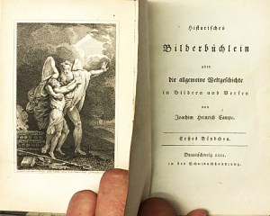 3. CAMPE, Joachim Heinrich Historisches Bilderbüchlein oder die allgemeine Weltgeschichte in Bildern und Versen. Deel een (is alles wat verscheen). Braunschweig, in der Schulbuchhandlung, 1801. 15 x 10 cm. Eenvoudige oude halflinnen band. (18), 228 p. Met 18 kopergravures, waarvan 17 naar een ontwerp van Franz Ludwig Catel en 1 ongesigneerd. Gemarmerde sneden. 1e druk. Wat verbruind en een beetje los. Naam op het schutblad (‘Severijn’).