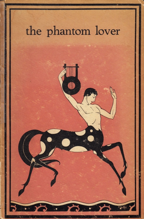 44. STEVENSON, Henry V. The Phantom Lover. (Poems). Chicago, AD Weinthrop, 1926. Geïllustreerd karton. (10), 38 p. Omslagontwerp door Leslie Powell en portret van de auteur (frontispice) door Jack Fisk. 1e druk. Rug versleten. Opvallende omslag deels verkleurd. Ex libris met opschrift ‘Dorothy Alice Read from Archer’.