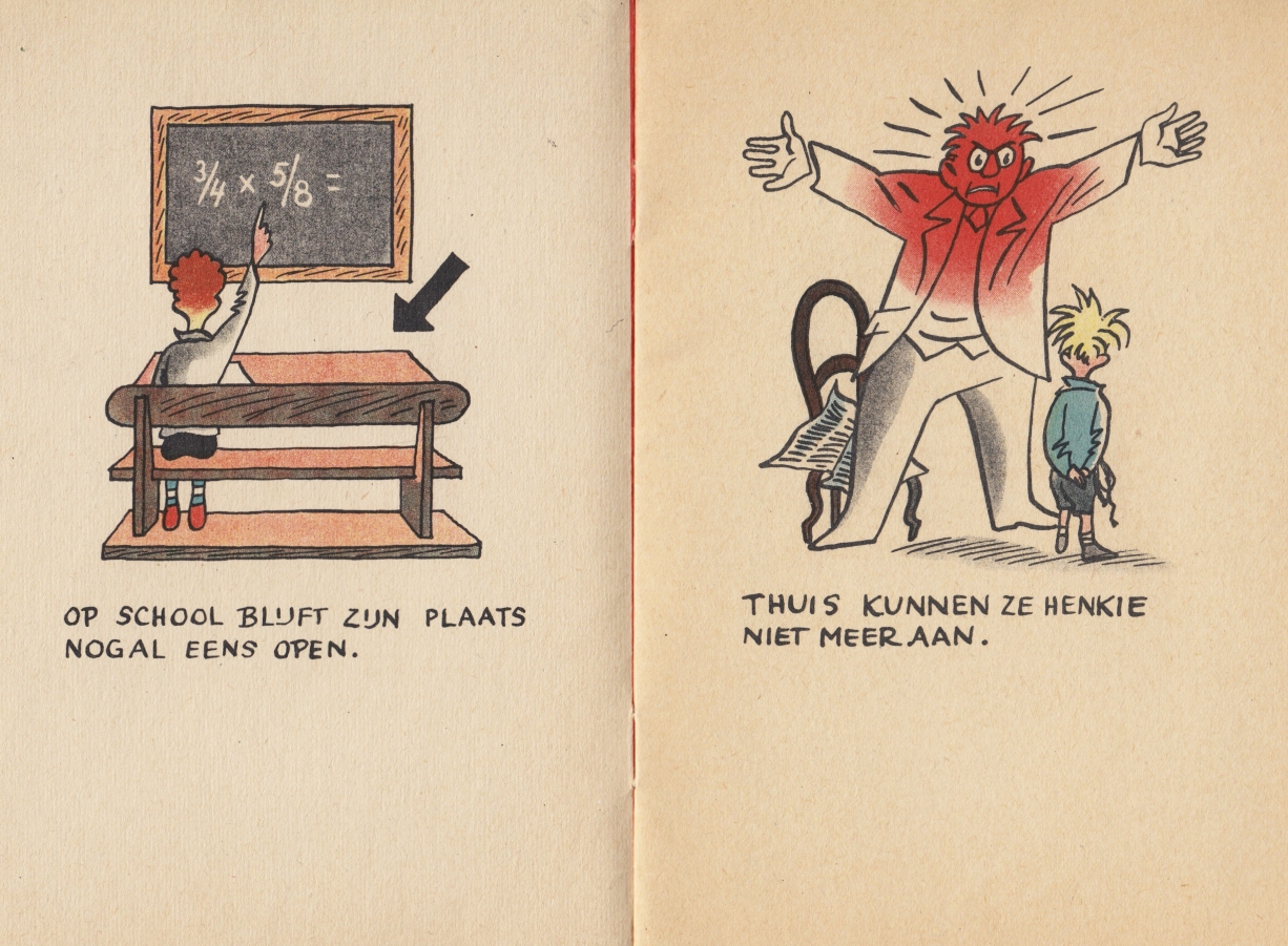 55. WORM, Piet Dit is Henkie… Arnhem, Pro Juventute, (ca. 1950). 16 x 11 cm. Geniet. 16 p.+ flap (incl. omslag). Gedrukt naar kleurenlitho’s van Piet Worm. Geheel getekend en naar het handschrift gedrukt. 1e druk. Watervlek (van een beker) voorop. Rugje iets ingescheurd.