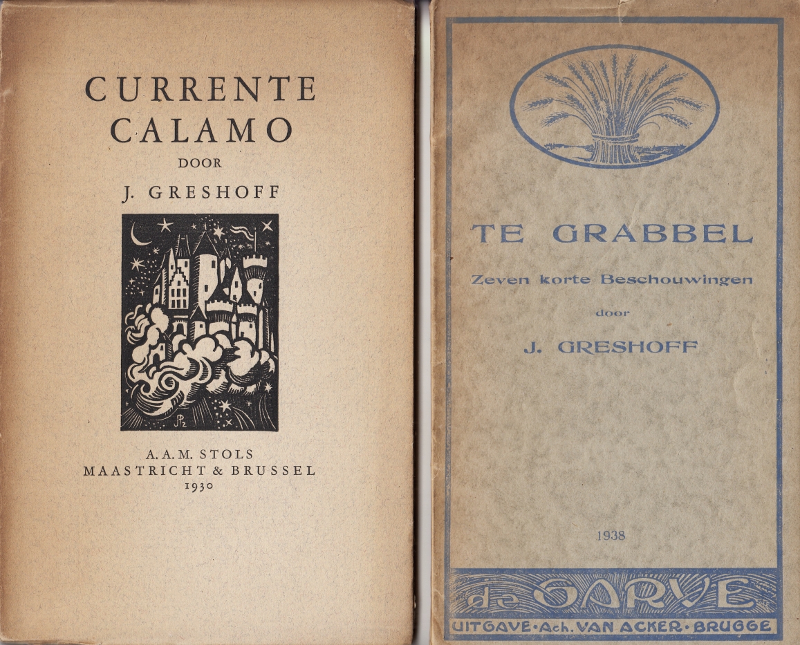 15. GRESHOFF, J. Currente calamo. Maastricht-Brussel, A.A.M. Stols, 1930. Serie Luchtkasteelen 5. Ingenaaid. 72 p. Gedrukt in 150 genummerde exemplaren op handgeschept papier ‘De Fortuin’ van Pannekoek (dit is nr. 7). Als frontispice én voorop de houtsnede van J.P. Franken Pzn. met het kasteel in de wolken. 1e druk. Rugje licht beschadigd, verder mooi.