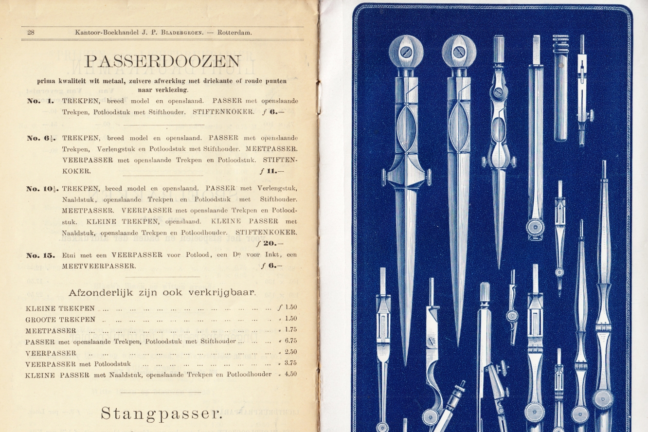 2. BLADERGROEN, J.P. Fabriek van lichtdrukpapier, magazijn van Kantoor- en Teekenbehoeften. Prijscourant van Teekenbehoeften. Rotterdam, Nieuwehaven 153, ca. 1905. Genaaid met rood sitspapier. 32 p. Veel illustraties, een uitklapbaar, een in blauw gedrukt. Rug iets versleten, klein plakzegeltje op de voorkant.