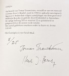 * Eén van de 25 genummerde exemplaren die door auteur en vertaler werden gesigneerd. Tranströmer (1931-2015) zou de Nobelprijs voor Literatuur winnen in 2011. Het aantal handgeschreven opdrachten en signaturen van Tranströmer is beperkt, omdat hij na een hersenbloeding in 1990 niet goed meer kon schrijven, en alleen nog bibberig kon signeren met ‘T.T.’.